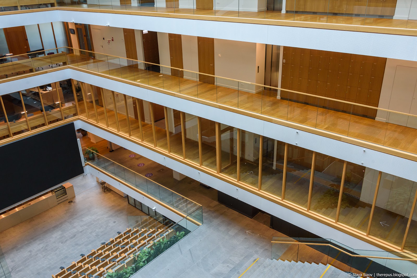 ... или 6-м, смотря с какой стороны смотреть. В здание можно попасть либо со стороны проспекта Конституции, либо со стороны улицы Upės. Таким образом грамотно используется естественный рельеф.
